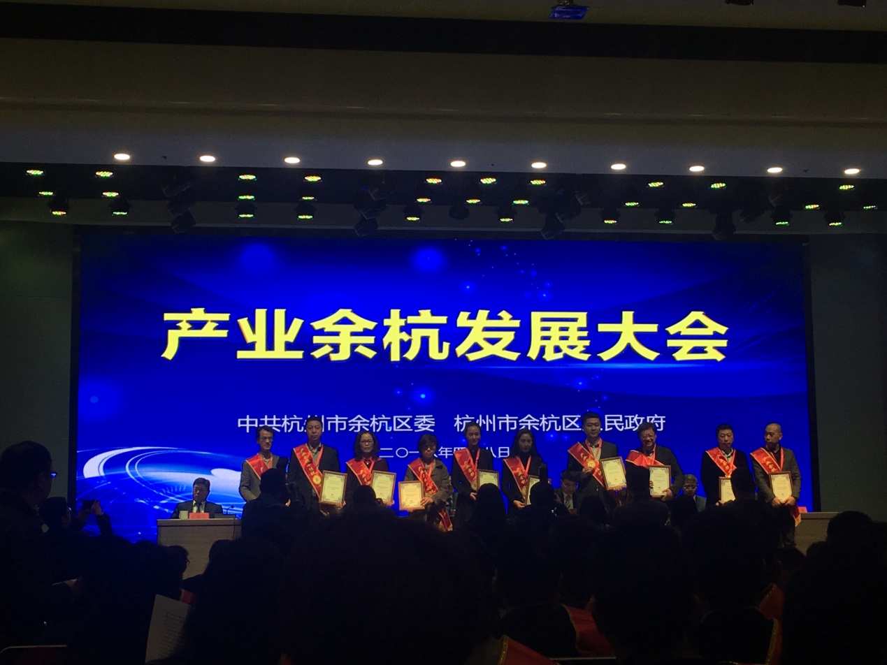本次大会的主题是“产业为主,优势再造”,会前播放的电视专题片《产业为王,优势再造》生动的展示了余杭区企业欣欣向荣的现状,同时也基本反映了中国产业升级转型的概况。会议由区委副书记、区长朱华主持,在区委常委、常务副区长祝振伟宣读表彰决定后,依次颁发了卓越贡献企业、综合贡献企业、十佳信息经济企业、十佳高新技术企业等101项奖项。其中阿里巴巴集团因为其对余杭区的卓越贡献而荣获产业余杭卓越贡献企业奖,同时获得由长江汽车制造的5辆新能源大巴以及1250克纯金打造的金牌;我司获得产业余杭十佳高新技术企业奖以及400克纯金打造的金牌,同时获得该奖的还有浙江运达风电股份有限公司、杭州工业锅炉有限公司等;老板集团、诺贝尔集团、西奥电梯、贝达药业、南方泵业等20家公司获产业余杭综合贡献企业二十强。
